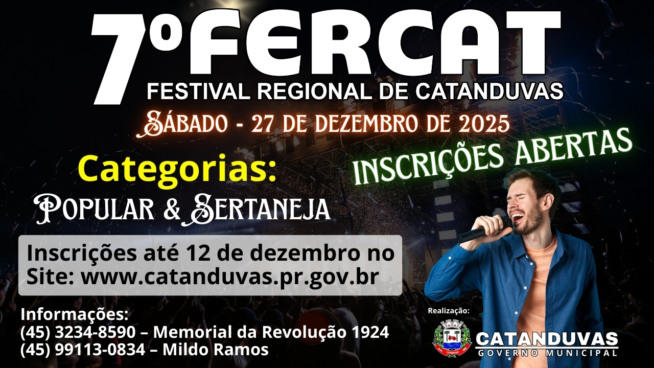 Sábado – 27 de dezembro de 2025 Categorias: Popular Sertaneja Inscrições Abertas Inscrições até 12 de dezembro no site: 👉 www.catanduvas.pr.gov.br I...